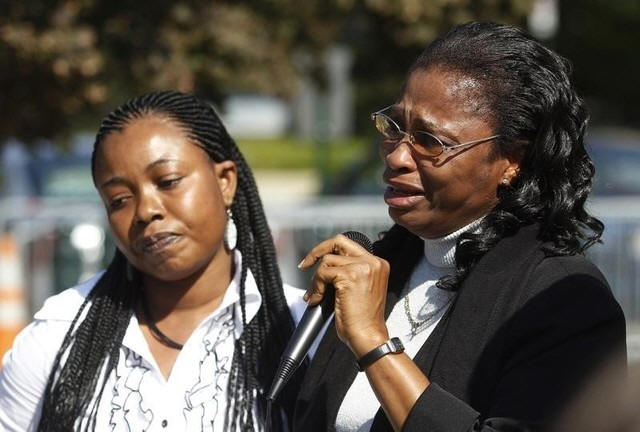 Plaintiff Esther Kiobel (R) speaks during a protest against Royal