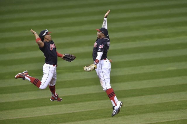 Indians shortstop Francisco Lindor (left) high fives center fielder