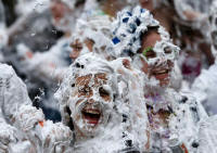 are covered in foam as they take part in the traditional 'Raisin