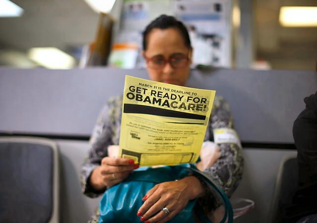 Arminda Murillo, 54, reads a leaflet on Obamacare at a health