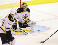 Bruins goalie Tuukka Rask (40) makes a save during the second