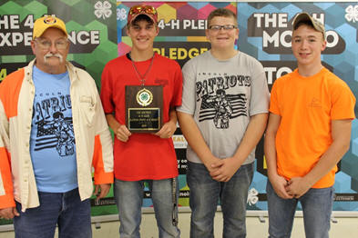 For the third year in a row, a team from Logan County 4-H won the team division of the State 4-H Shotgun Shoot. The event was held Saturday, Oct. 1 at the Brittany Shooting Park in Bunker Hill. Pictured, left to right, are Volunteer Leader William Kennett, Brandon Batchelder, Brayden Rohlfs, and Landon Alcorn. The fourth member of the team, Seth Gleason, was not present for the photo.