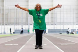 Ann Bing, 82, celebrates crossing the finish line during the track