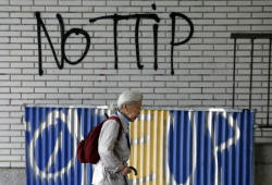 A pedestrian walks past graffiti that reads, "No TTIP",