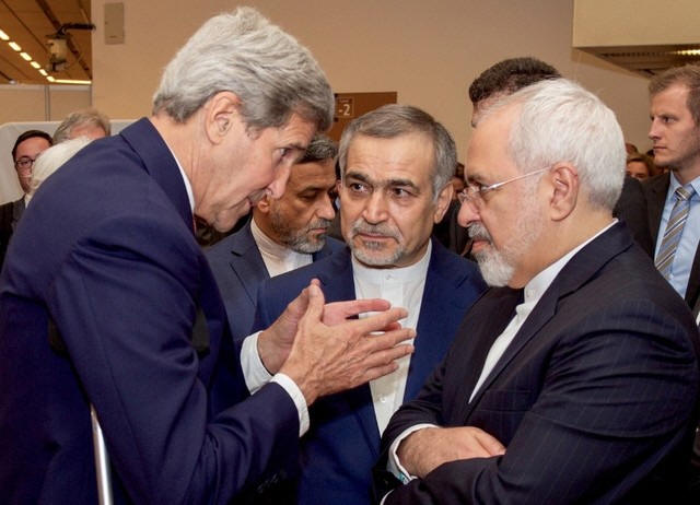 Kerry (L) speaks with Hossein Fereydoun (C), the brother of Iranian