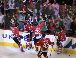 pounded a power-play rebound past Corey Crawford with 3:49 gone in