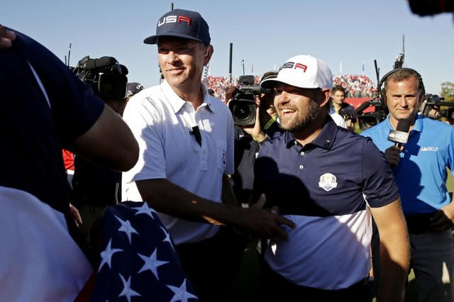 Team USA captain Davis Love III celebrates with Ryan Moore of the