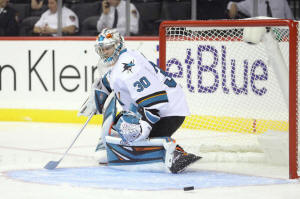 Sharks goalie Aaron Dell (30) makes a save against the New York