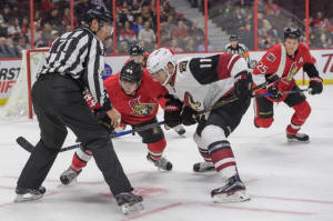 Senators center Jean-Gabriel Pageau (44) faces off against Arizona