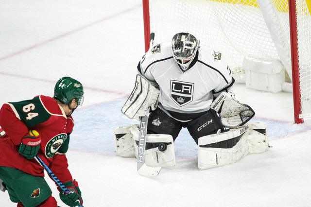 Kings goalie Peter Budaj (31) makes a save on Minnesota Wild forward