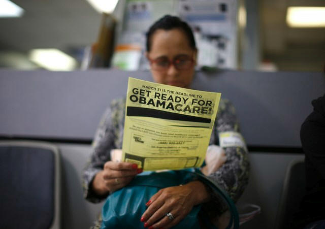 Arminda Murillo, 54, reads a leaflet on Obamacare at a health