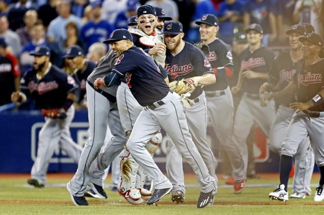 The Cleveland Indians celebrate beating the Toronto Blue Jays in