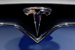 A Tesla logo is seen on media day at the Paris auto show, in Paris,