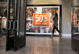 A woman walks by a discount sign at an Abercrombie & Fitch store at