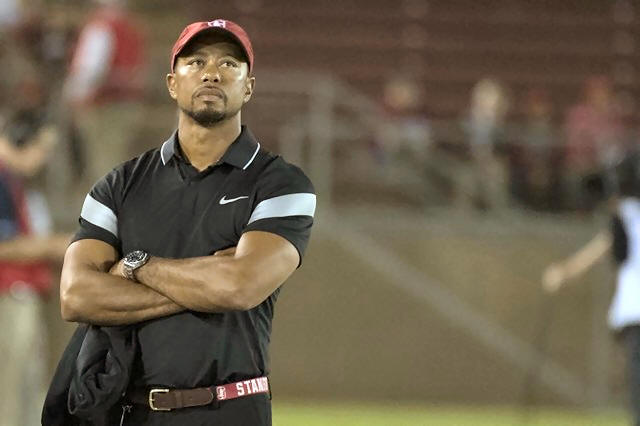 Tiger Woods watches before the game between the Stanford Cardinal