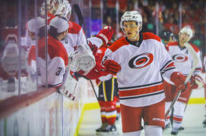 Hurricanes left wing Jeff Skinner (53) celebrates his goal with
