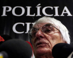 Formula One chief Bernie Ecclestone talks to the media in police