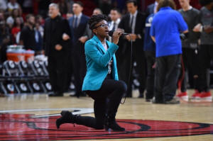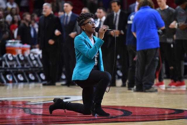 National Anthem singer Denasia Lawrence kneels as she sings the