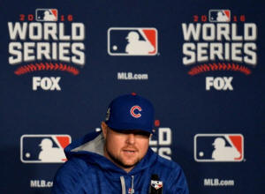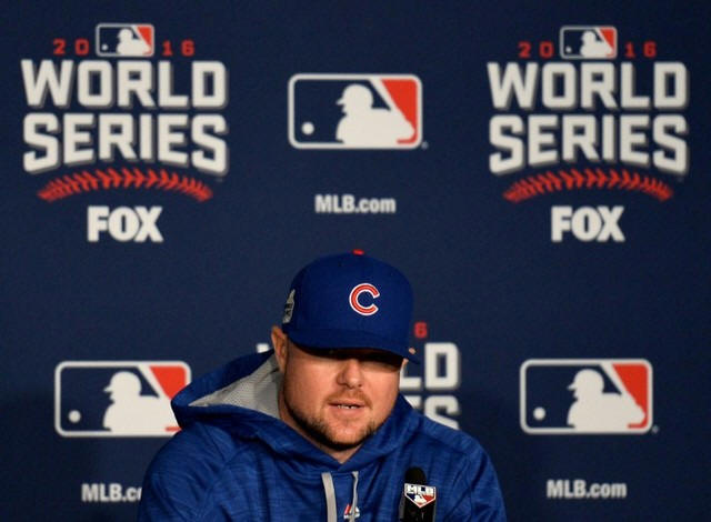 Cubs starting pitcher Jon Lester (34) talks to the media during work