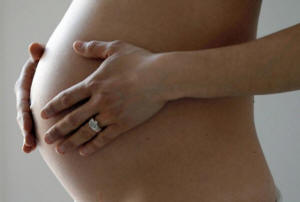 A pregnant woman, in the last trimester of her pregnancy, poses in