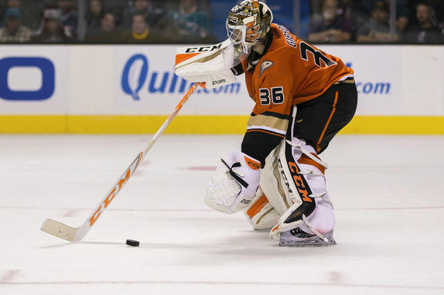 Ducks goalie John Gibson (36) saves a shot by the San Jose Sharks in