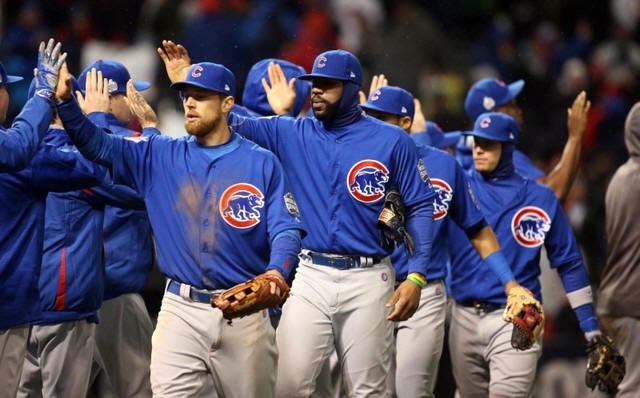 Chicago Cubs players Ben Zobrist and Jason Heyward celebrate after