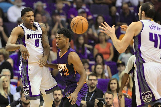 Kings forward Rudy Gay #8 makes a pass in front of Phoenix Suns