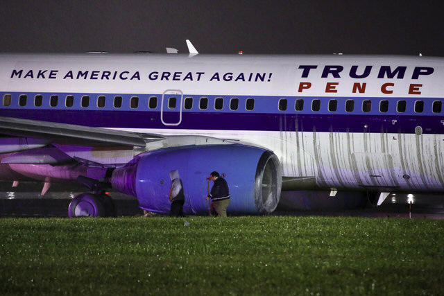 Men inspect a campaign plane that had been carrying U.S. Republican