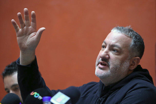 Spencer Tunick gestures during a news conference before using the Day of