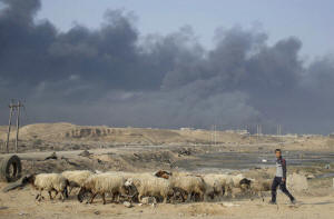 A man walks with ships near Qayyara, south of Mosul, Iraq October