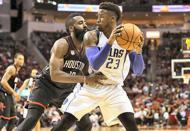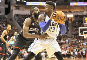 Rockets guard James Harden (13) guards Dallas Mavericks guard Wesley