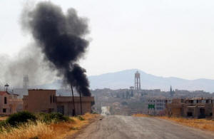 Smoke rises from Taybat al Imam town after rebel fighters from the