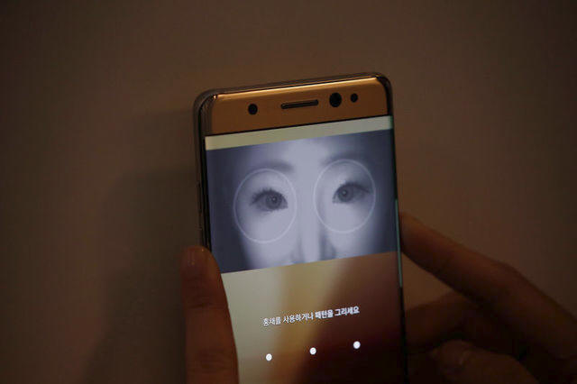 A model demonstrates iris recognition function of Galaxy Note 7 new