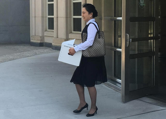 Former Air China employee Ying Lin exits the building after a