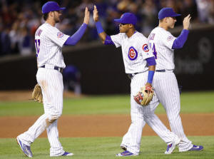![]() Chicago Cubs shortstop Addison Russell (27) celebrates with third baseman Kris Bryant (17) their 5-4 win against the San Francisco Giants at Wrigley Field. Mandatory Credit: Kamil Krzaczynski-USA TODAY Sports |