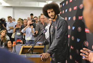 San Francisco 49ers quarterback Colin Kaepernick talks to media