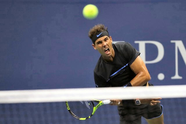 Rafael Nadal of Spain serves against Andrey Kuznetsov of Russia (not