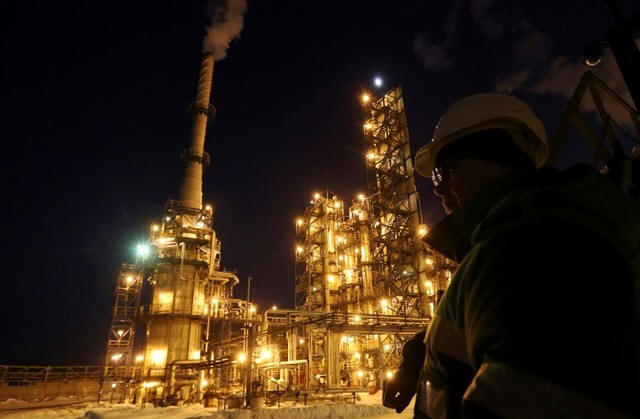 A worker looks on at the Bashneft-Ufaneftekhim oil refinery outside