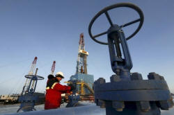 A worker checks an oil pipe at the Lukoil-owned Imilorskoye oil