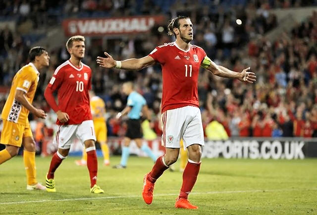 Wales' Gareth Bale celebrates scoring their fourth goal from the