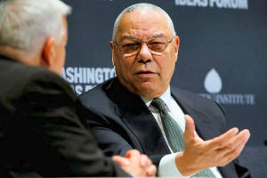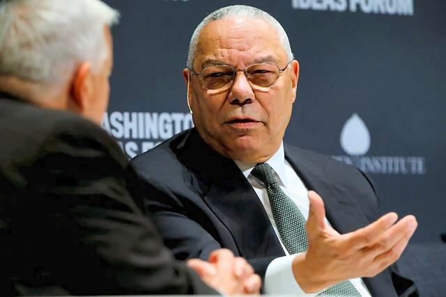 Former U.S. Secretary of State Colin Powell (R) takes part in an
