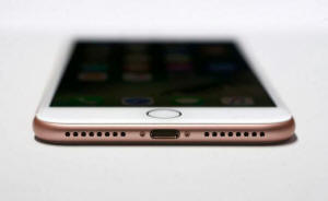 The Lightning connection on the Apple iPhone 7 is shown on display
