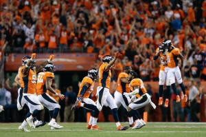 Broncos players celebrate after a missed field goal attempt by the