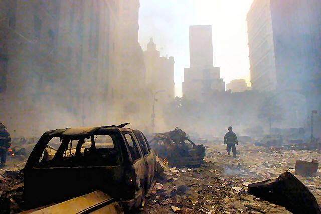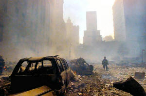A firefighter walks amid rubble near the base of the destroyed World