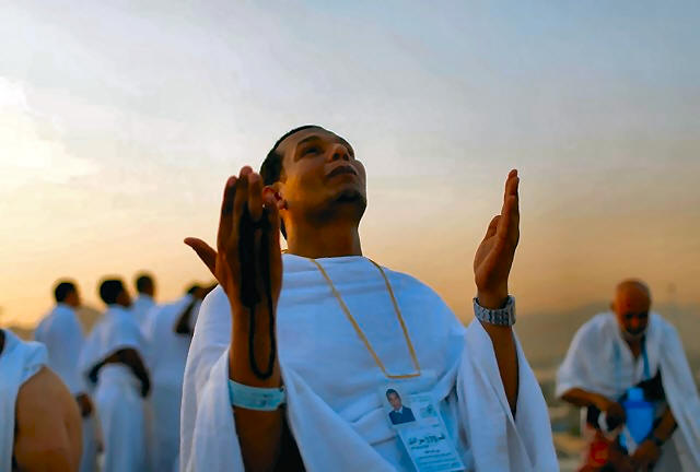 A Muslim pilgrim prays on Mount Mercy on the plains of Arafat during