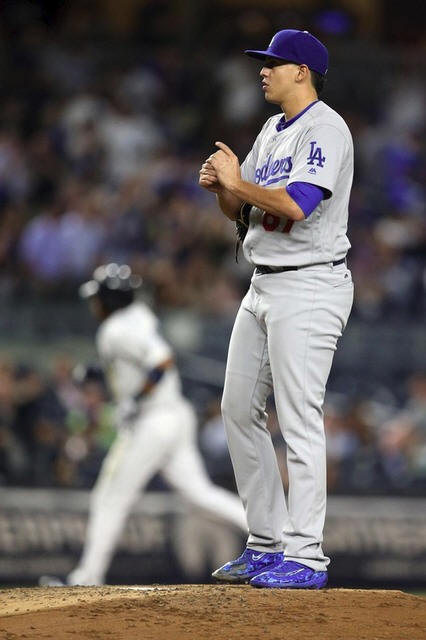 Dodgers starting pitcher Jose De Leon (87) reacts as New York