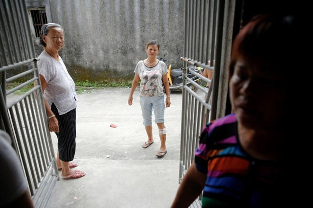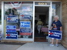 On the right, Rebecca Drake, chairperson of the Logan County Democrats, stands in front of their newly opened office at 503 Woodlawn Road in Lincoln.