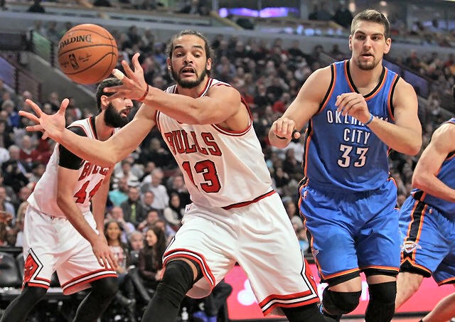 Bulls center Joakim Noah (13) grabs a rebound past Oklahoma City Thunder