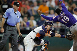Astros catcher Jason Castro (15) tags Texas Rangers third baseman