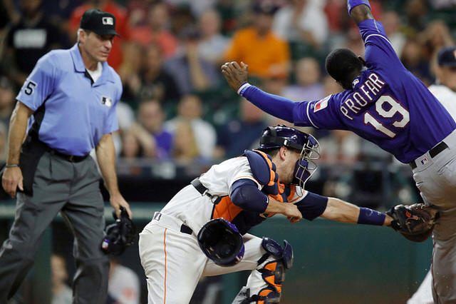 Jurickson Profar (19) out at home plate in the ninth inning at